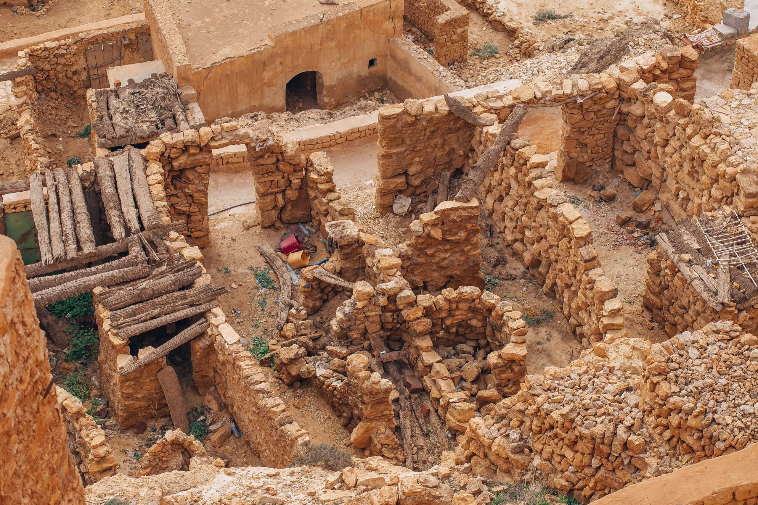 Cheninis Häuser scheinen sich regelrecht an den Hang zu klammern. Sie bestehen aus nebeneinander in den Berg gegrabenen Höhlenräumen. Die meisten sind zerfallen und verlassen, nur die Moschee erstrahlt in blendendem Weiß.